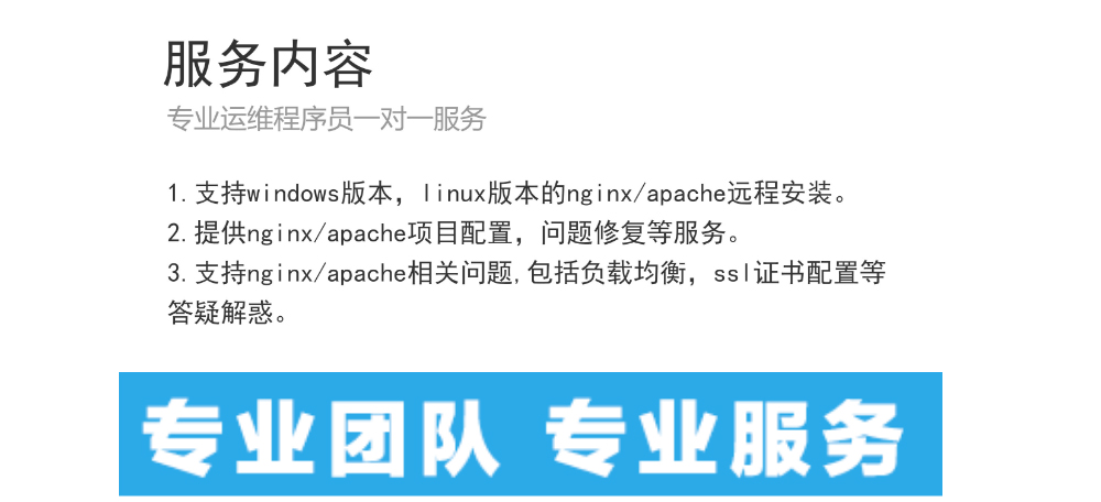 面临Nginx或Apache安装困扰,远程安装支持,轻松搭建服务器环境! 需要配置Nginx负载均衡,高效稳定的负载均衡方案!SSL证书让您的网站更安全!协助配置,数据传输加密无虞!遇到Bug让您头疼?快速定位、修复,服务器运行顺畅无阻!